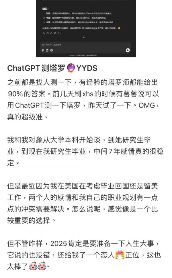 用ChatGPT解读塔罗牌,晓琳不仅获取了她想要的信息,还深入思考了自己内心真正的需求。“AI并没有直接告诉我应该怎么做,而是通过引导让我进行更深层次的自我反思,肯定了我内心深处已经存在的答案,让我变得更坚定了。”