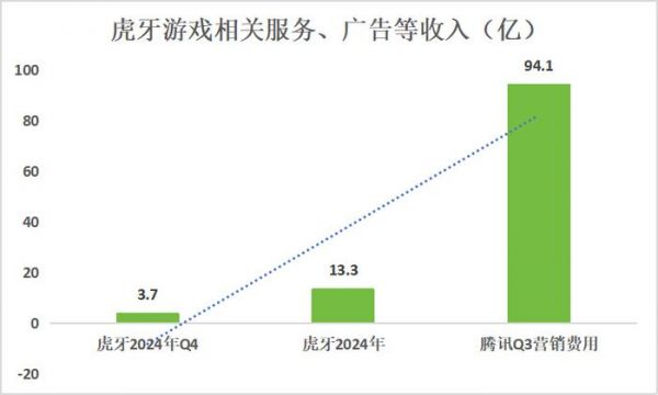 2024年全年,虎牙来自游戏相关服务、广告和其他业务的收入同比增长145.4%,至13.3亿元。其中,四季度这一收入为3.7亿元。腾讯的四季度报要比虎牙晚发一天,而此前的三季度,腾讯的营销费用超过了90亿元——作为腾讯旗下最大的游戏内容平台(可能没有之一),这个比例的对比显得有些夸张。