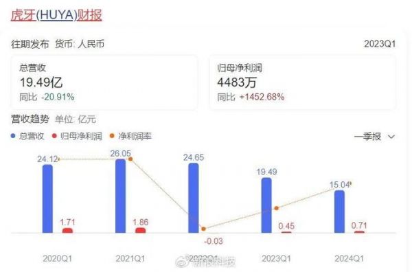 在新董事长林松涛上任前,虎牙2023年一季度的收入有19.49亿元。而来到2024年一季度,这个数字下降到了15亿元,下滑超过25%。
