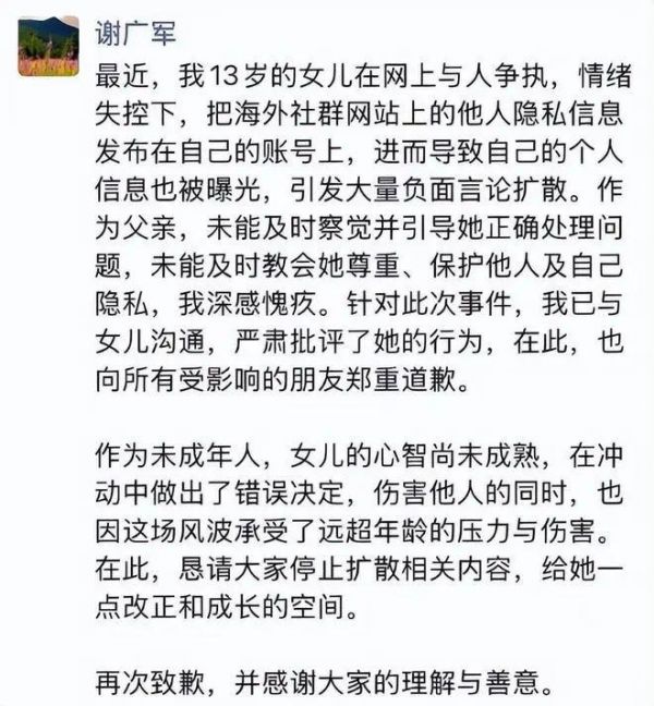 谢广军表示:“我13岁的女儿在网上与人争执,情绪失控下,把海外社群网站上的他人隐私信息发布在自己的账号上,进而导致自己的个人信息也被曝光,引发大量负面言论扩散。作为父亲,未能及时察觉并引导她正确处理问题,未能及时教会她尊重、保护他人及自己隐私,深感愧疚,向所有受影响的朋友郑重道歉。”