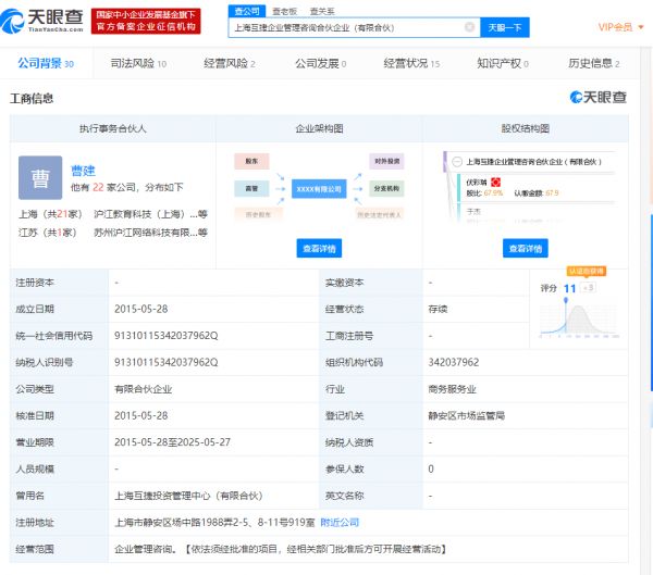 上海互捷企业管理咨询合伙企业(有限合伙)成立于2015年5月,法定代表人为曹建,经营范围为企业管理咨询。