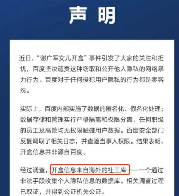 3月19日,百度就“谢广军女儿开盒”事件发布声明。声明着重强调了,开盒信息并非源自百度。而是来自海外的社工库——一个通过非法手段收集个人隐私信息的数据库。网上流传的“当事人承认家长给她数据库”的截图,内容为不实信息。