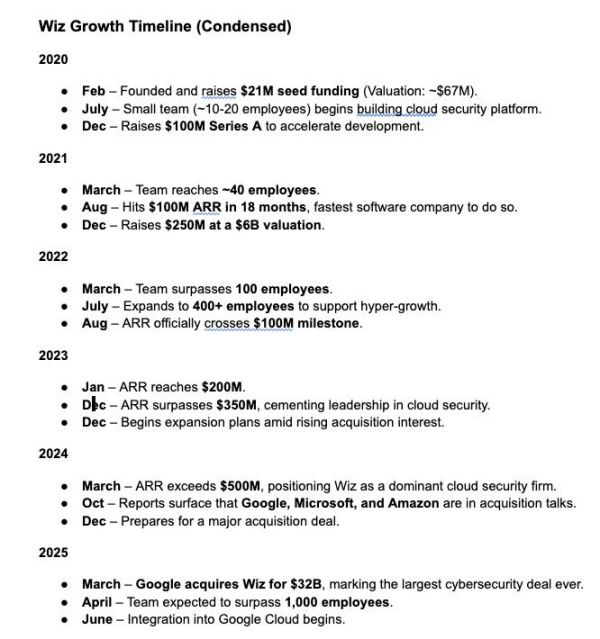 到了 2024 年,Wiz 的年度经常性收入已超过 5 亿美元,并吸引了谷歌、微软和亚马逊等科技巨头的注意,纷纷展开收购谈判。最终,在 2025 年,谷歌以 320 亿美元的价格成功收购 Wiz,并开始将其整合到谷歌云平台中。