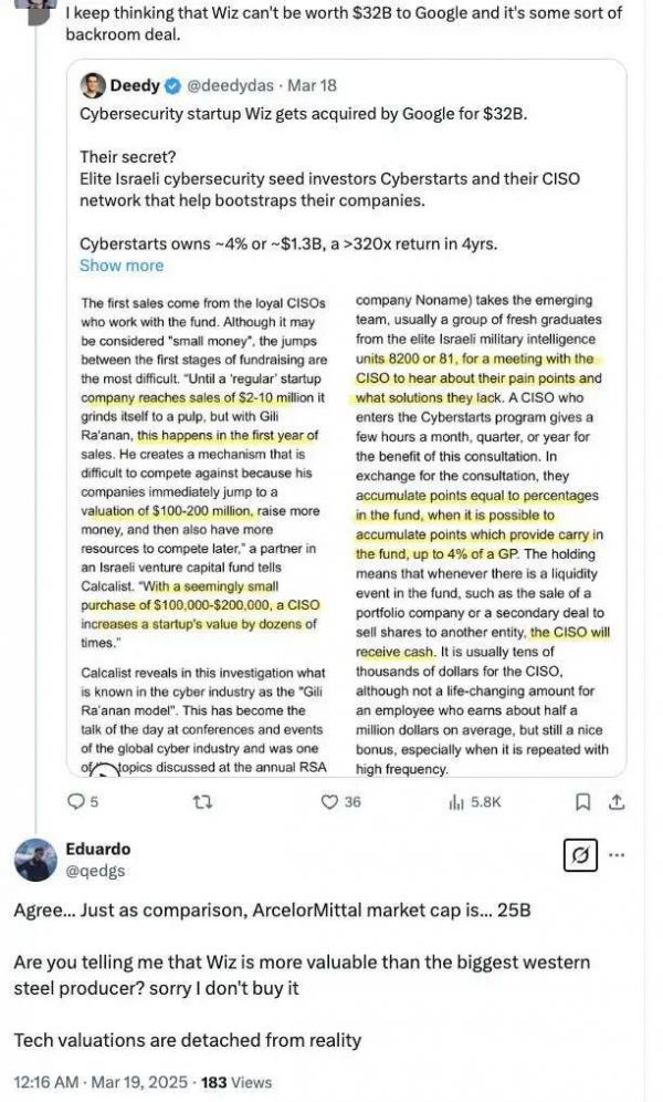 尽管 Wiz 在安全领域展现了实力,但更多人还是对这笔大额收购感到不解。毕竟,Wiz 作为一家初创企业,用一位网友的话来说:“这家公司成立 5 年,也就是 1825 天,或者说 43800 小时,却在这段时间里创造了 320 亿美元的‘价值’。平均每小时收入近 75 万美元,简直难以置信。”