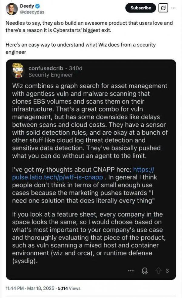 值得注意的是,在上述安全工程师对 Wiz 的解读中,他认为企业不应盲目追求“大而全”的解决方案,而应根据自身需求选择合适的工具。他强调,在选择云安全工具时,应深入评估公司的具体用例,并针对特定需求选择专业工具,例如 Wiz 或 Orca 用于漏洞扫描,Sysdig 用于运行时防御。