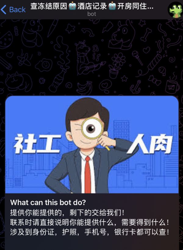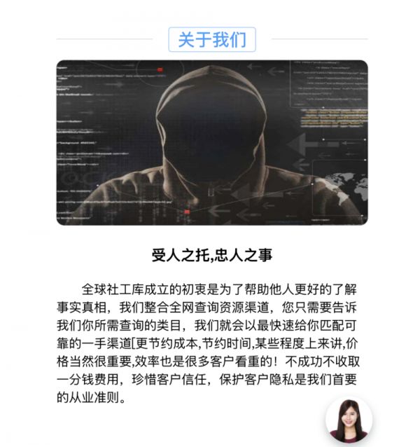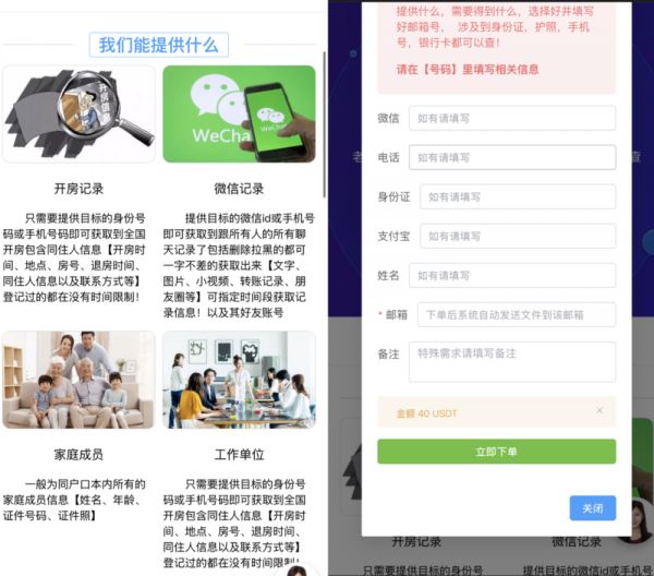 根据百度的公告,蓝鲸记者查到了这个海外社工库。这里提供范围广泛的查询服务,不同查询价格不同,用户可以搜到开房信息、微信记录、家庭成员、工作单位、居住地址等各种隐私信息,并且365天24小时全年无休。
