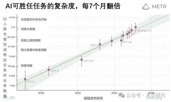 这与最近OpenAI和Anthropic的说法不同,从奥特曼到阿莫迪,都在说今年内智能体编程可以胜过人类。但研究认为,AI只能胜任人类不用4分钟就能完成的任务,也就是说最简单的任务。