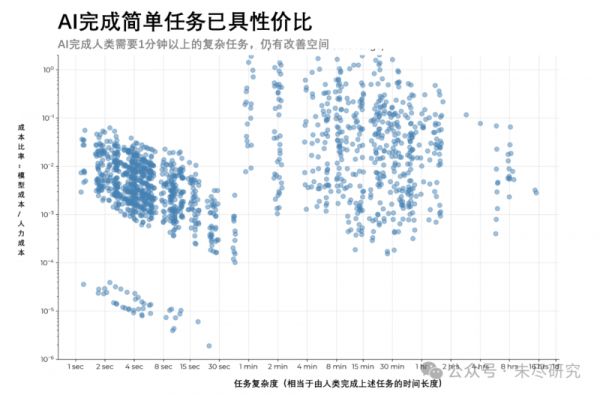 (说明:对应1460个成功完成的任务,纵坐标代表任务的复杂度,即人类完成该任务的时长,横坐标代表任务由智能体完成任务的性价比,即模型成本与人类薪酬的比例。)