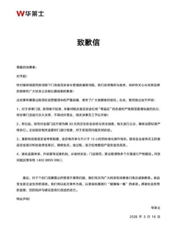 3月18日,华莱士官方微博发文致歉,并表示将永久关停涉事门店,相关涉事员工予以开除。