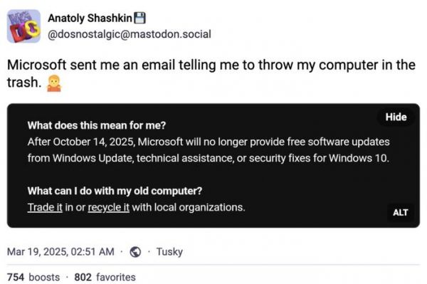 针对此举,不少用户涌入社交媒体,强烈吐槽:“微软给我发了一封电子邮件,让我把我的电脑扔进垃圾桶。”