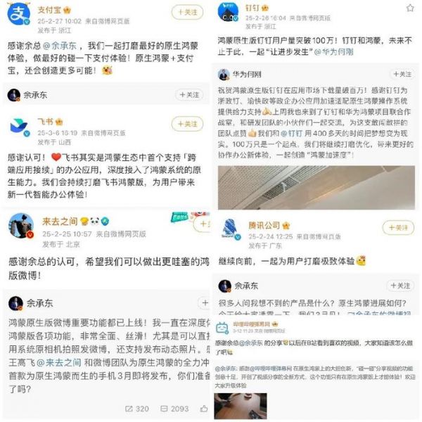 事实上,在发布会前的近一个月时间里,华为常务董事、终端 BG 董事长、智能汽车解决方案BU董事长余承东和华为终端 BG CEO 何刚就已经在微博上持续地安利鸿蒙应用大有不同的体验,也引发了多个鸿蒙伙伴的回应和互动。微博 CEO 王高飞(来去之间)在看到余承东对鸿蒙版微博“调用系统原相机”、“发布动态照片”等功能的赞赏后,就回复到: