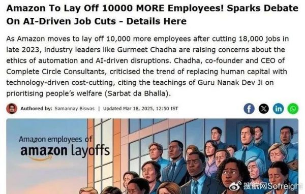 3月18日,亚马逊宣布,计划2025年初裁掉约1.4万个岗位,每年预计能节省21亿到36亿美元。