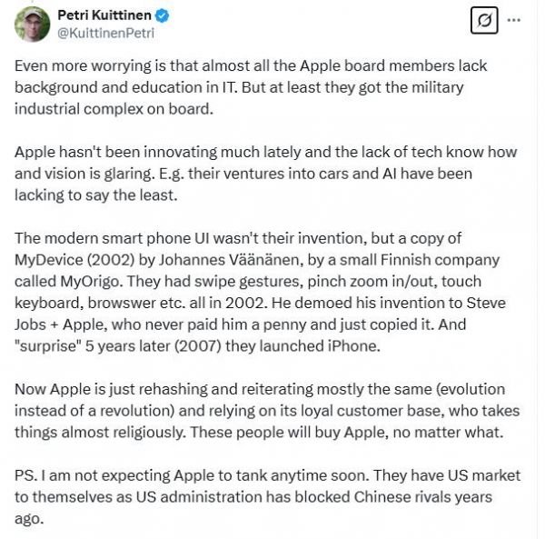 对此,有网友表示,“更令人担忧的是,几乎所有苹果董事会成员都缺乏信息技术方面的背景和教育。苹果最近创新乏力,技术知识和远见的缺失十分明显。如今,苹果大多只是在重复和改进已有的东西(是渐进式发展而非革命性创新),并依靠其忠实的客户群体,这些客户对苹果产品近乎盲目追捧。无论如何,这些人都会购买苹果产品。”