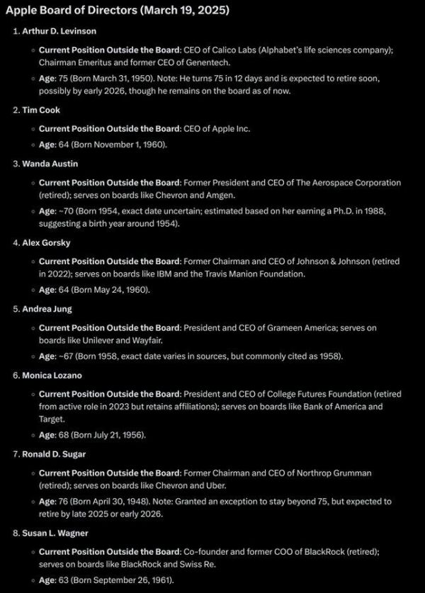 另据 DHH 介绍,苹果董事会成员的平均年龄达到了 68 岁,近半数成员超过 70 岁,最年轻的也有 63 岁。高管团队的情况也好不到哪儿去,平均年龄徘徊在 60 岁左右。“我完全尊重长辈们的智慧,但全球顶尖的科技公司如今由一个老龄化的团队在统治,这实在太荒谬了。”