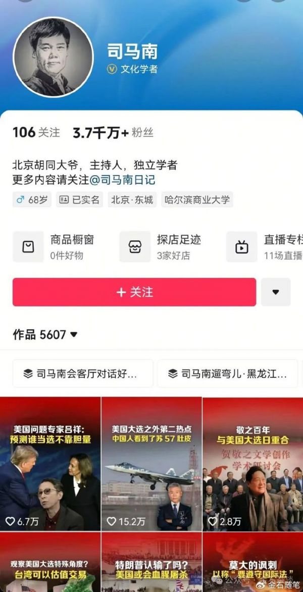 司马南,知名的自媒体大V、学者,微博粉丝超300万,抖音粉丝竟然高达3700万,此外今日头条粉丝超1600万,据市场统计其所有媒体矩阵粉丝总量超6000万。