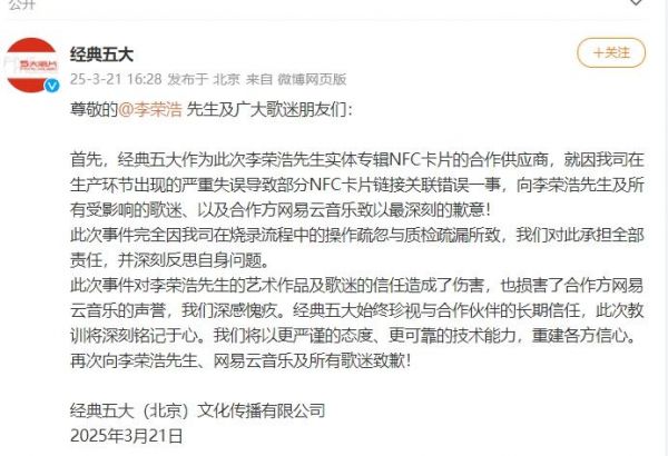 此外,李荣浩实体专辑NFC卡片的合作供应商@经典五大 也在当日下午发文致歉:此次事件完全因公司在烧录流程中的操作疏忽与质检疏漏所致,对此承担全部责任,并深刻反思自身问题。