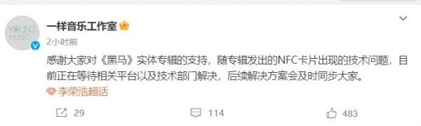 随后,李荣浩工作室(@一样音乐工作室)回应称:随专辑发出的NFC卡片出现的技术问题,目前正在等待相关平台以及技术部门解决,后续解决方案会及时同步。