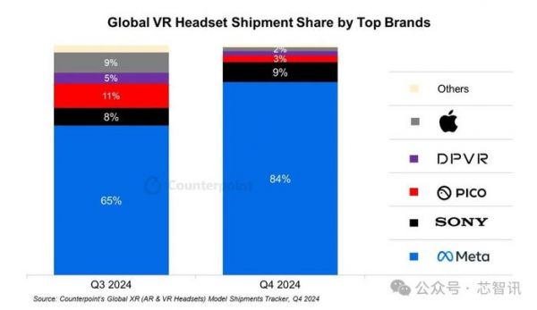 2024Q4全球VR头显市场:Meta以84%份额稳居第一,苹果销量环比大跌43%