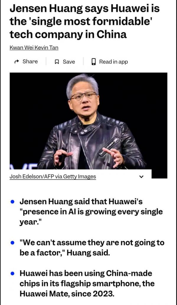还得是老黄,这是对华为有种棋逢对手的感觉,在接受英国《金融时报》采访时,能公开讲华为是中国最强大的科技公司,当然英伟达也不差!