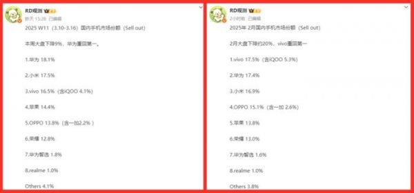其次,尽管vivo在2024年以17.38%的份额领跑(含iQOO子品牌),但2025年2月仍居首位,W11却滑落至第三。