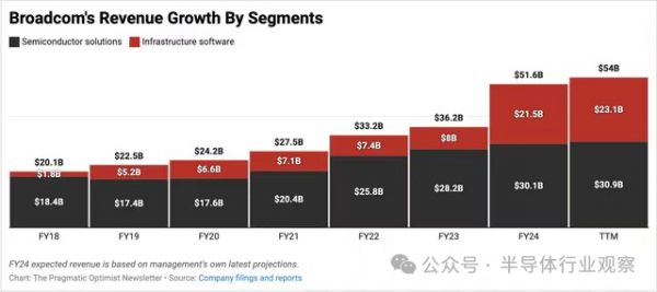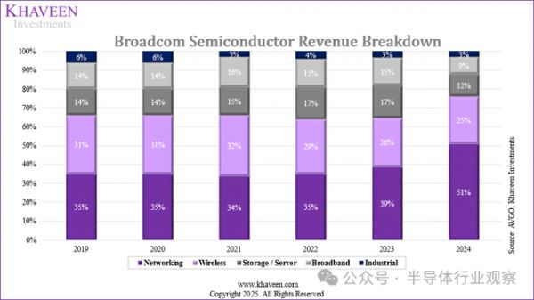 上图显示了博通半导体收入的分布情况,WiFi、RF和蓝牙芯片属于无线领域,占其半导体总收入的25%。据报道,苹果与博通合作开发的定制ASIC属于网络领域,该领域目前占博通半导体收入的51%。