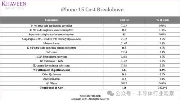 虽然苹果声称C1芯片提高了电源效率并延长了iPhone 16e的电池寿命,但据报道它缺乏mmWave支持,并且“可能导致下载和上传速度变慢”,这与高通的调制解调器不同。我们认为这表明,在这次转换中,性能并不是苹果的首要考虑因素,成本是一个更大的因素,如前所述,基带估计占iPhone总成本的6%。在eBay上,上一代iPhone 13的WiFi/蓝牙集成芯片售价为9.64美元。以此为参考,我们计算出它约占iPhone成本的2.3%,低于高通的调制解调器,我们认为这可能是苹果优先开发自己的调制解调器并在推出自己的WiFi芯片之前推出第一款调制解调器的原因。