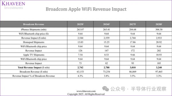 据分析师郭明錤称,博通为苹果供应了“超过3亿”个WiFi芯片,因此我们认为它是苹果WiFi芯片的主要供应商。我们估计苹果的转换对这三款产品(iPhone、HomePod和Apple TV)的收入影响。从iPhone开始,我们参考之前的单位出货量预测和每台9.64美元的定价假设。对于HomePod和Apple TV的出货量,我们根据智能音箱和联网电视设备的复合年增长率进行了估算。我们的计算显示,博通对2023财年的苹果收入产生了33.6%的影响,但对公司总收入的影响较小,2025年为4.3%(27亿美元),到2028年将下降到3.3%(32亿美元)。