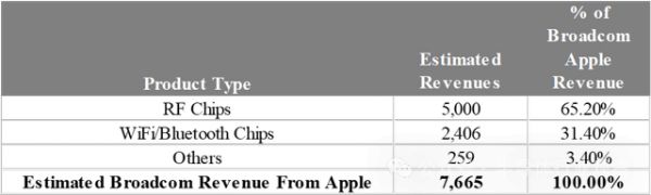 为了分析博通及其竞争对手与苹果在射频方面的业务,我们根据上文计算的博通在苹果协议中的射频份额,估算了每家公司从苹果获得的射频收入。