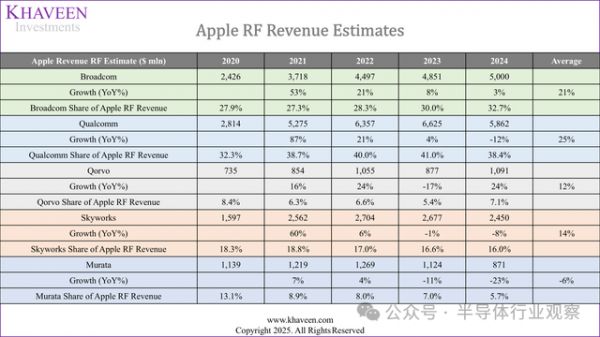 除了WiFi芯片业务,我们还研究了苹果到博通的其他收入来源,例如射频芯片,并分析在市场竞争日益激烈的情况下,博通能否维持与苹果的射频业务。