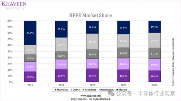 从RF市场份额来看,博通在竞争对手中占有重要地位,但竞争非常激烈,没有一家公司在市场份额上占据主导地位。博通、高通、Qorvo、Skyworks和Murata的市场份额相对相似,因此竞争非常激烈。在我们之前对高通和Skyworks的分析中,我们强调了高通在RF方面的优势,因为它拥有调制解调器-RF集成技术,而其他RF竞争对手不生产调制解调器芯片,因此缺乏这种技术。我们强调了高通在RF设计方面的胜利,包括在iPhone 16系列中获得了一个重要的RF socket,而Skyworks则失去了这个socket,这巩固了高通在RF市场的强势地位。