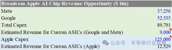 由于苹果尚未公布其AI服务器芯片的开发细节,因此我们对其开发细节进行了简单的估算,以了解其对博通的潜在收入机会。据摩根大通称,博通开发谷歌的TPU和Meta MITA芯片预计将为博通贡献90亿美元的总收入。鉴于苹果报告的未来4年内投资承诺5000亿美元或每年约1000亿美元,我们按比例估算出博通每年125亿美元的收入机会。