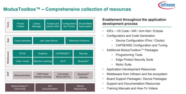 在开发工具上,英飞凌ModusToolboxTM 是一款功能强大的嵌入式软件开发平台,旨在为开发人员提供一站式的便捷开发体验,包含了多个关键组件,包括了板级支持包(BSP)、外设驱动程序、中间件和代码示例。英飞凌提供了多款开箱即用的中间件和软件库,涵盖 HMI、图形、连接、安全、语音和音频、机器学习、Wi-Fi、蓝牙、电机、安全等,用户只需关注应用层的软件创新即可。