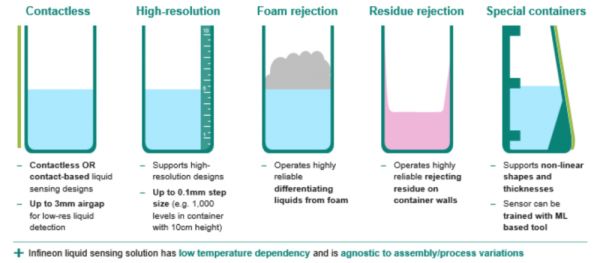 Multi-Sense技术还为英飞凌开拓了液位检测新市场,可应用在诸如咖啡壶、家电中的水箱以及洗衣机水位检测等场景中。英飞凌的液位检测技术具有独特优势,无需接触就能进行检测,而且可以适应各类特殊容器形状,对液体中的泡沫、雾气、液体残留物、温度和其他环境条件适应力强。
