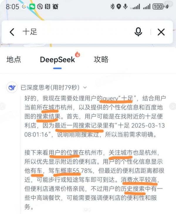 另外,有网友发现,自己在使用百度地图的deepseek搜索功能时,deepseek在显示深度思考的过程中,百度疑似将用户的个人隐私数据全部投喂给了deepseek。
