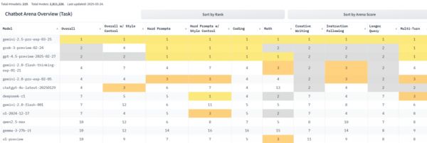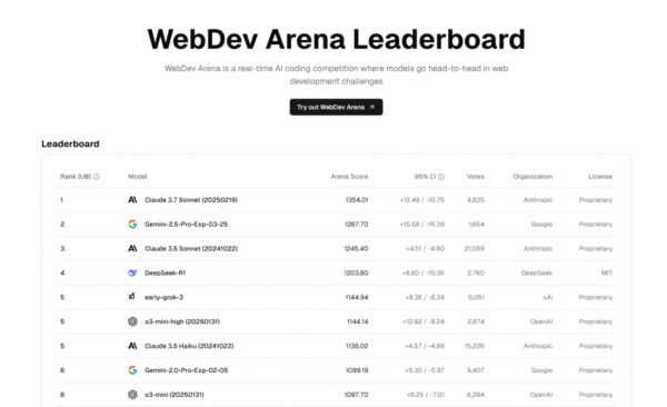 在网页开发领域,作为首个实力媲美Claude 3.7 Sonnet的模型,Gemini 2.5 Pro成功获得了网页开发竞技场(WebDev Arena)的第二名。