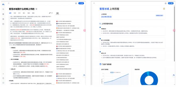 以一个简单问题为例,当我们想知道"蜜雪冰城是什么时候上市的"时,由于蜜雪冰城的上市时间是2025年3月3日,属于近期新闻,而大多数AI工具的预训练数据截止日期通常滞后一到两年,这些信息便无法被普通AI工具获取。此时,AI搜索工具便显示出其独特价值。