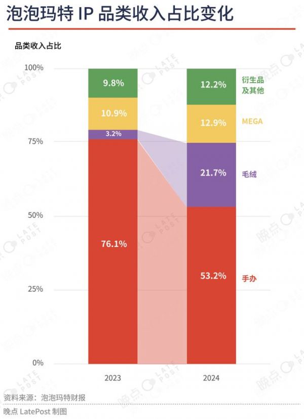 为了激发创意创新、提高生产效率,泡泡玛特启动组织架构调整,产品部门按品类拆分出 MEGA 组(高端手办产品线)、毛绒组、积木组等,各组更独立运作。