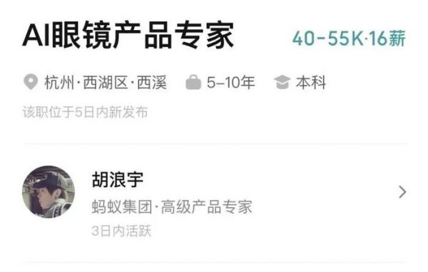 近日,Boss直聘上一则招聘信息显示,蚂蚁集团正在招聘AI智能眼镜产品专家。根据该职位描述及要求,应聘者需要负责AI眼镜产品应用功能设计,并负责多种原型应用产品方案搭建与测试,与主产品一起讨论选择最优方案,以及负责研究AI眼镜的应用产品设计范式,形成结构化的文档/方案。