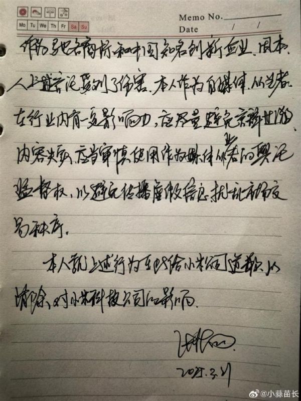 极目新闻记者注意到,“小蒜苗长”微博有67.4万粉丝。在发布上述致歉声明大半个小时后,张绪国接着又发了一条微博说:思前想后,感觉光有一个文字的道歉不够真诚,我专门手写了一遍,以彰显对小米道歉的决定的诚意。