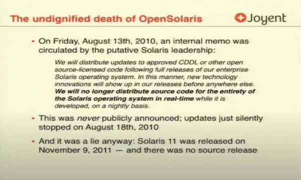 当时,OpenSolaris也是宣布“我们将不再实时发布整个Solaris操作系统的源代码”。但从那一刻起,源代码就再也没有公开过。