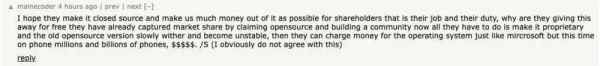 我希望他们干脆把Android变成闭源,并尽可能地为股东赚钱——毕竟,这才是他们的职责。他们为什么还要免费提供这个系统?他们已经通过宣称开源、建立社区成功占领了市场,现在只需要让它变成专有软件,而旧的开源版本会逐渐衰落、变得不稳定。然后,他们就可以像微软那样,对操作系统收费——但这次是在手机上,对数百万、甚至数十亿台设备收费(显然我并不认同这种做法)。
