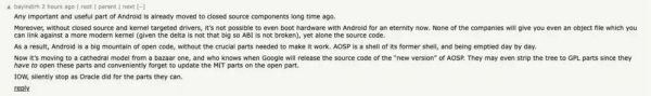 AOSP之前是基于Apache 2.0许可证发行,尽管谷歌也表示会继续release源代码,且一再强调这并非闭源,但对于谷歌将开发转为private的行为,有网友评论说,“如果一个项目依赖于一家公司进行持续开发,那么开源许可证就没有任何意义。”