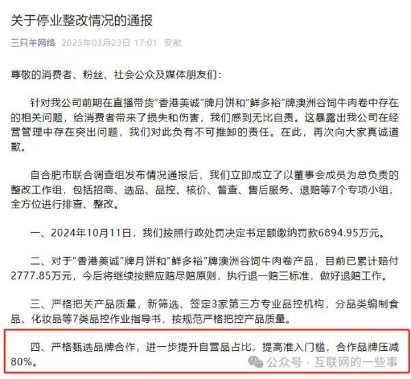 据官方通报,三只羊在整改期间引入了第三方品控机构,制定7类品控手册,将合作品牌压缩80%,并推出“退一赔三”政策,同时设立独立售后账号,确保消费者权益得到保障。