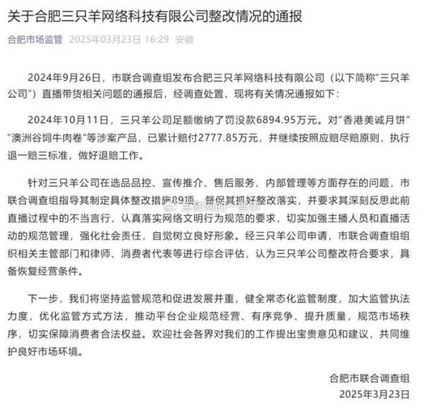 然而,198天后,三只羊卷土重来。2025年3月23日,合肥市联合调查组发布通报,宣布三只羊已按要求足额缴纳罚款,并累计赔付消费者2777.85万元,完成89项整改措施,具备恢复经营条件。至此,曾经的“直播之王”终于迈过监管门槛,准备重返战场。