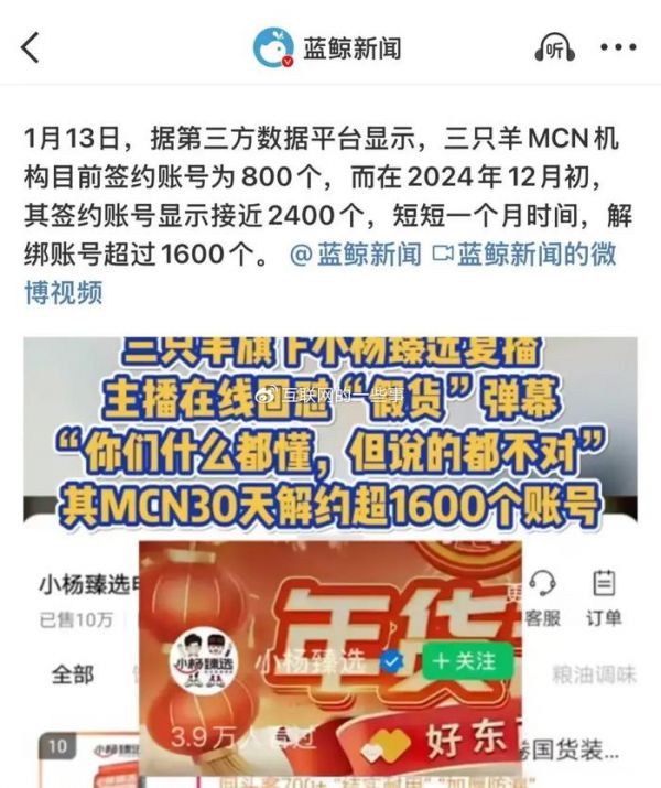 数据显示,三只羊停播后的半年时间里,小杨哥的抖音账号掉粉超过1200万,粉丝数从1.2亿下降至1.08亿,旗下签约达人从2400人锐减至800人,甚至连大楼二期建设都曾一度停滞。