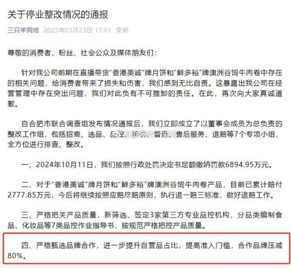 据官方通报,三只羊在整改期间引入了第三方品控机构,制定7类品控手册,将合作品牌压缩80%,并推出“退一赔三”政策,同时设立独立售后账号,确保消费者权益得到保障。