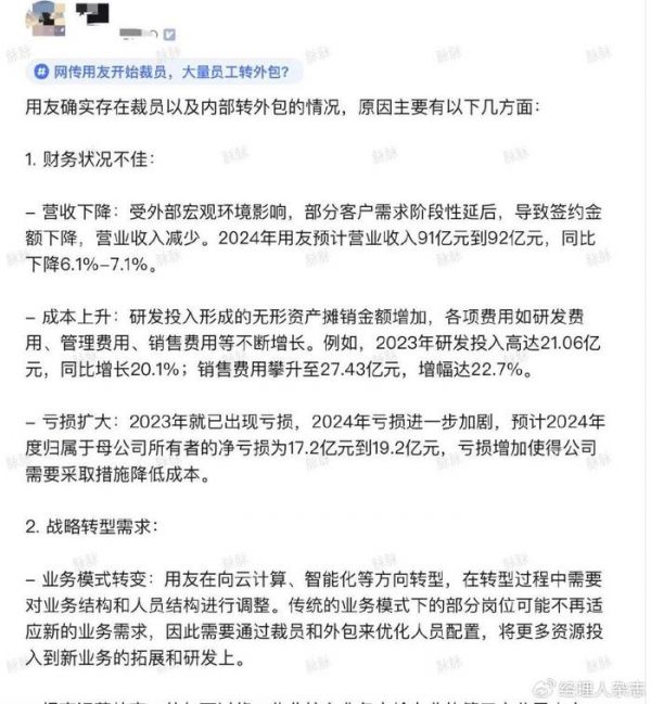 相关资料显示,用友在2024年就已经进行了一轮大减员。自2024年起,用友网络着手进行了人员结构的优化调整,至2024年末,员工总数已从原先的24949人缩减至21249人,裁员幅度高达3700人。2024年度,用友在离职补偿金方面的支出同比激增了1.4亿元。
