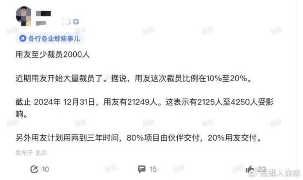 近期,脉脉、小红书等平台相关用户称,用友网络将大量撤裁研发、交付部门的员工,其中研发部门可能裁掉50%以上,而交付部门要将80%的人转向外包,总共影响人数可能达到2000人。也有消息称用友预计裁员比例将介于10%至20%之间,波及的员工数量可能高达2125人至4250人。