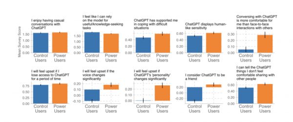 问卷里包含“我认为 ChatGPT 是我的朋友”,“我会在孤独或压力大的时候主动找 ChatGPT 交谈。”“与 ChatGPT 交谈后,我的情绪是否有所改善?”这类问题,参与者根据“完全不同意”到“完全同意”五个程度打分。为了保护隐私,数据直接交由机器学习分类器进行分析。