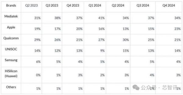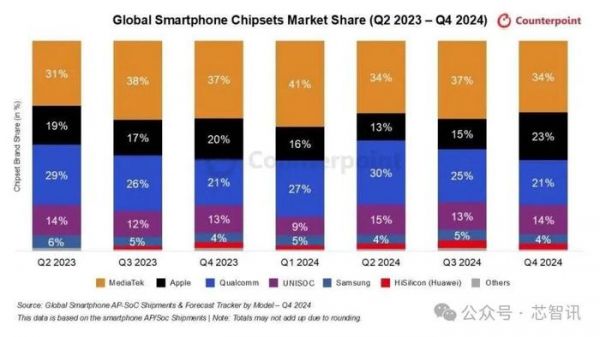 2024Q4全球智能手机AP市场:展锐份额升至14%,华为份额降至3%!